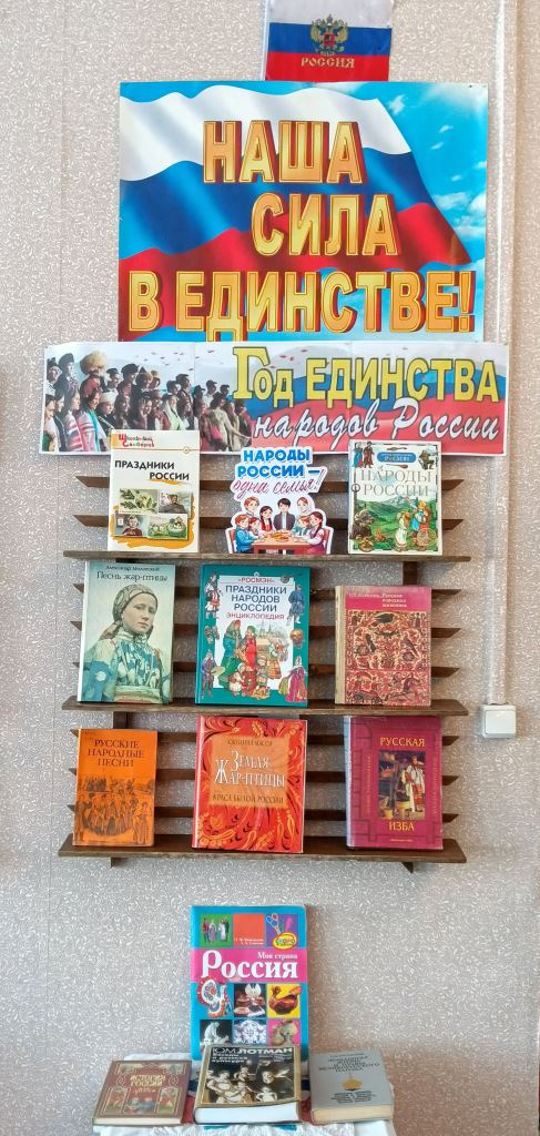 В рамках Года единства народов России в Васильевской сельской библиотеке оформлена книжная выставка «Наша сила в единстве», на которой представлены книги, повествующие о богатой истории и уникальной культуре народов нашей страны.