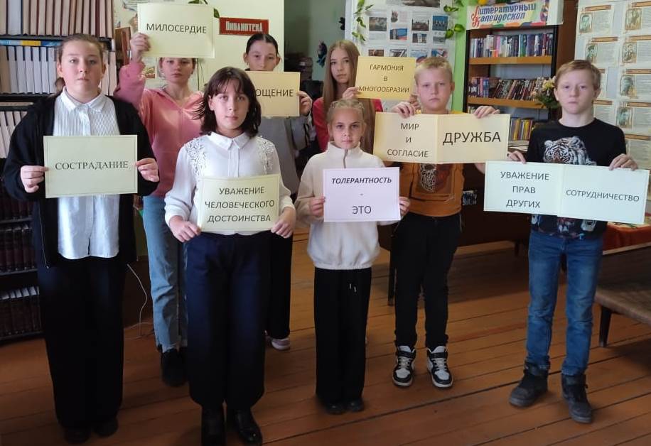 В Солдатской сельской библиотеке прошёл час общения «Толерантность, дружба, мир». Ребята познакомились с понятием «толерантность», узнали, какие черты характеризуют толерантную личность. Заведующая филиалом Алексеева Е.С. рассказала о том, как важна терпимость в отношениях между близкими людьми, в семье, на учёбе, между поколениями. Дети приняли участие в играх: «Давайте поприветствуем друг друга», «Аукцион знаний», «Дерево толерантности», показали сценку о терпимом отношении к людям, прослушали притчу «Ладная семья» и выполнили задание «Волшебные слова».