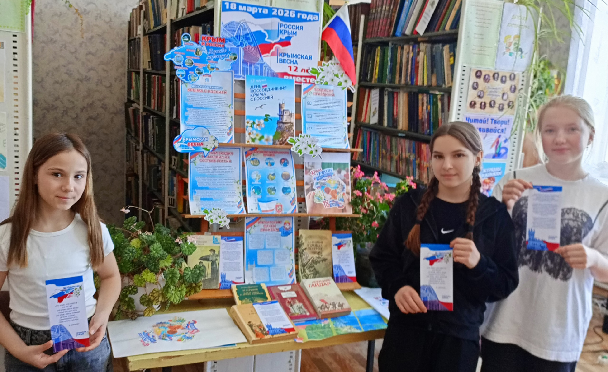 В честь этого знаменательного события в Марьино-Николаевской сельской библиотеке было организовано литературное путешествие под названием «Крымская весна. 12 лет вместе». Вместе с заведующей филиалом Чепуриной В.С. дети совершили увлекательное путешествие в прошлое Тавриды. Они прошли тропами Крымских гор, по которым когда-то ходили: А.С. Пушкин, А.П. Чехов, И.А. Бунин и насладились морскими пейзажами И. Айвазовского. Особое внимание было уделено героическому прошлому полуострова в годы Великой Отечественной войны. Ребята с большим удовольствием оформили плакат «Крым – Россия. Вместе и навсегда!», приняли участие в викторине. В завершение мероприятия каждый участник получил буклет с подробным описанием достопримечательностей Крымского полуострова.